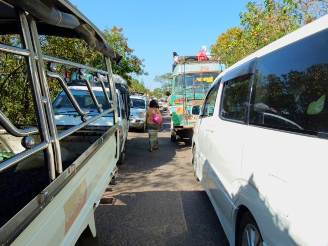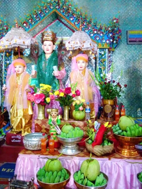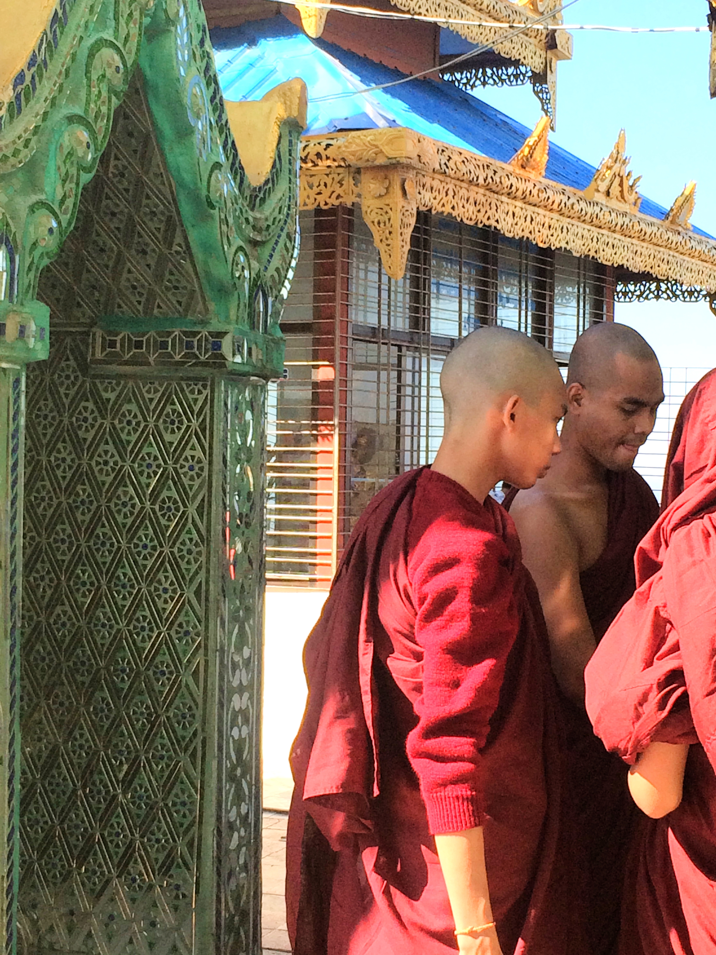After exploring the market we went to Phaung Daw Oo Pagoda where we walked around and saw the Five Statues of Buddha that have been rubbed and piled with gold leaf that they have lost their features and look like round shapes. There is a festival where they put four of the statues onto a golden boat shaped like a bird and parade through the villages. The boat is docked near the Temple so you can go see this enormous detailed boat.