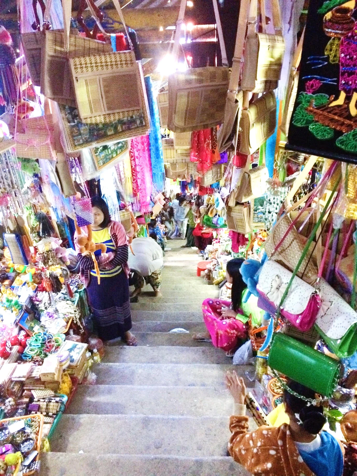Our last day in Inle Lake was busy, our first stop was to the Floating Market. Once we entered the market area a wooden boat with two women in it came up next to our boat. They were trying to sell silver products. As they showed us their wares they held onto our boat so we'd float down together. Then an older woman on a boat grabbed onto the other side of ours and was showing us flowers she had for sale. They both held on till we made it to the dock and we got out to walk around the rest of the market.