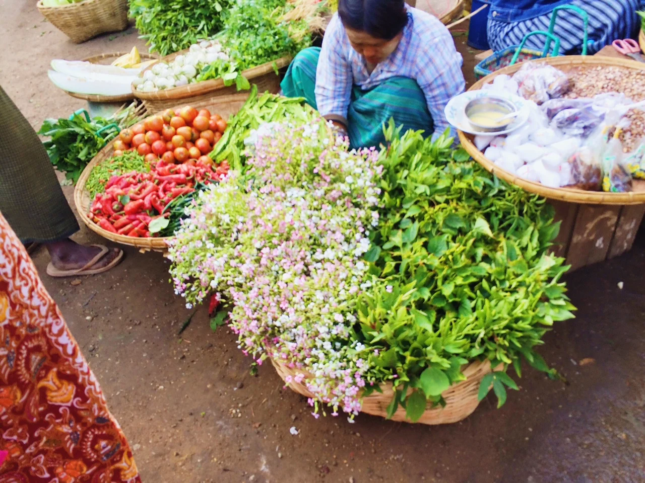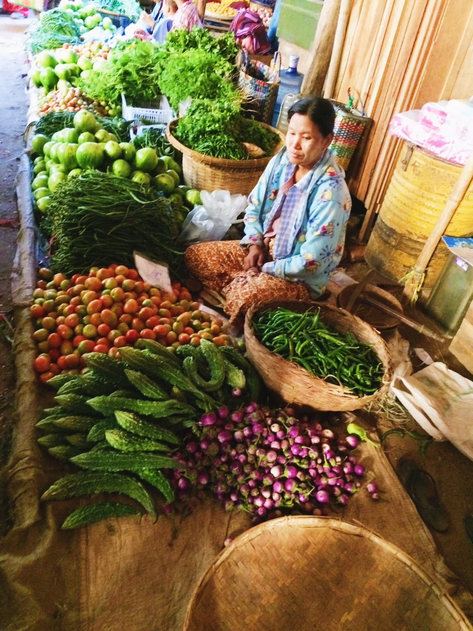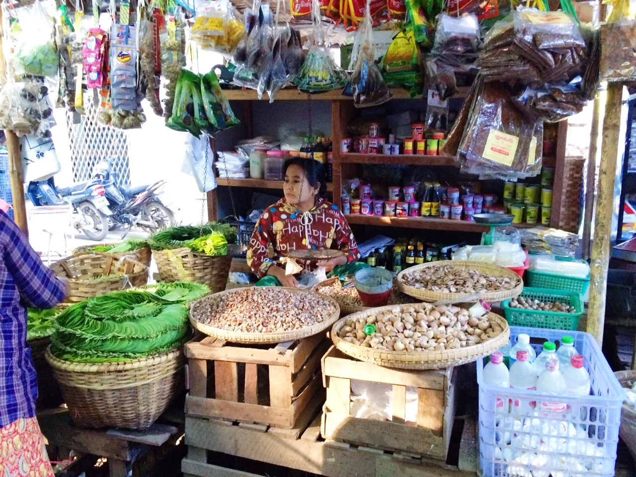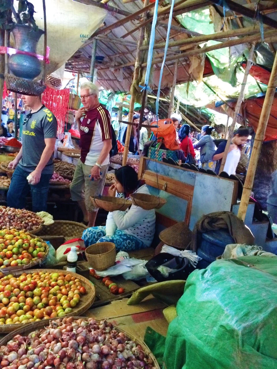 When we first arrived we wandered down the narrow dirt paths of the Nyaing Oi Market. There were fresh fruit and vegetable stands lining the sides and above our heads were tarps and scraps of fabric stuck together acting as a roof. The market place was incredibly busy with people haggling down produce prices and hurriedly walking past. My mom was enjoying the sights and trying to take everything in. She wanted to buy some of the more exotic looking fruits.